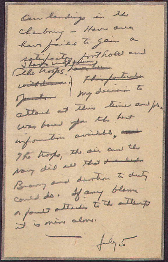 The note was written on June 5th 1944, the day before D-Day, Eisenhower scribbled a note to be used in the event of failure on the following day, taking all the blame on himself. His state of mind can be gauged by his writing of the wrong date at the end, 5th July instead of 5th June.