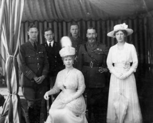 King George V and Queen Mary were both active in supporting soldiers during the war years and visited the Western Front numerous times and also paid repeated visits to hospitals of wounded soldiers. During one visit to France George suffered a broken pelvis when his horse rolled over on top of him.