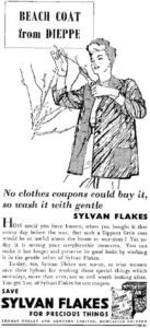 Although this miraculous home brand was a staple for many women the reason for its name is very unusual too. Six days before the disastrous Allied landing at Dieppe, France, on 19th August 1942, when 1524 servicemen were killed, an advert for Sylvan Flakes appeared in Newspapers with the heading ‘BEACH COAT from DIEPPE.’