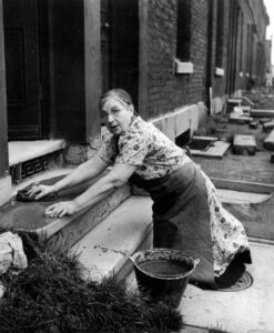 Cleaning was far more laborious than it is today, it was taken for granted that most housewives were very ‘house proud’. Publicly mopping and scrubbing the doorstep was a sign of domestic pride by working-class women.