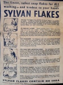 Clothes washing was tiresome for many housewives; soda crystals or solid blocks of soap led to worn hands. But gradually, more brands of washing powder such as Sylvan Flakes, with its ‘Do not destroy this carton, put it with the other wastepaper for the salvage collector’ instruction became available for the housewife.