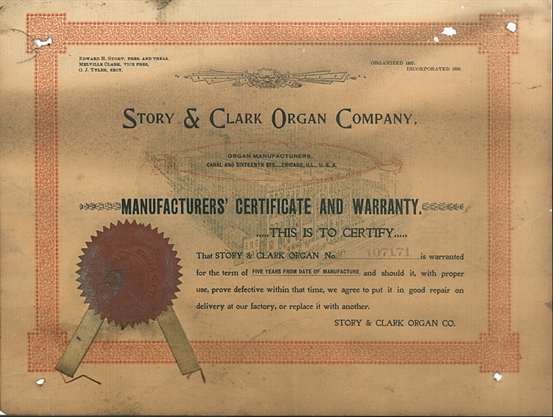 Name/TitleWarranty certificate - "Story & Clark organ company" - organ no: 107171 - for item no: 38298