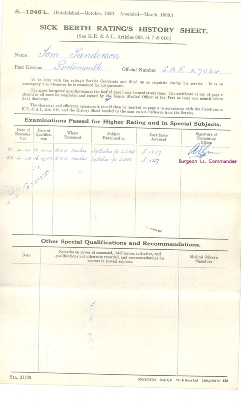 Name/TitleRoyal Navy Form S1246l - Sick Berth Rating's History Sheet - Tom Sanderson S.B.R. x7024 - 1941