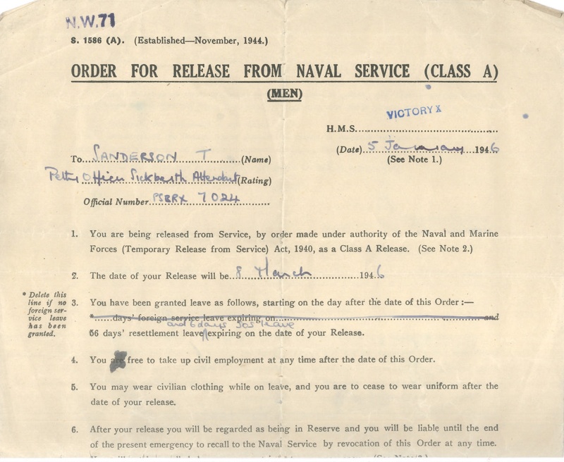 Name/TitleRoyal Navy form s1586(a) - order for release from Naval Service (class "A") - Tom Sanderson p/o sba - 05/01/1946