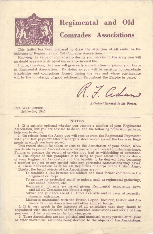 Name/TitleArmy information leaflet - "Regimental and Old Comrades Associations" - the War Office - September 1945