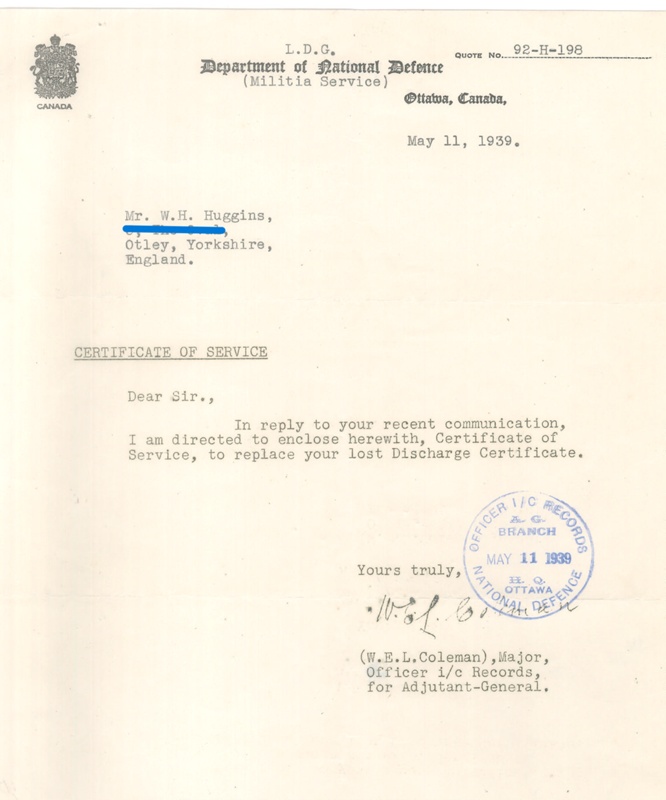 Name/TitleCorrespondence with Department of National Defence 11/5/39 - duplicate certificate of service - also letters from War Office re. application to Emergency Reserve by W.H.M. Huggins