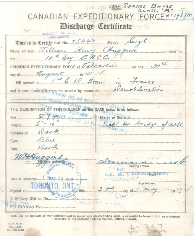 Name/TitleCanadian Expeditionary Force Discharge Certificate for W.H.M. Huggins No. 35446 - Dated 23/5/1919