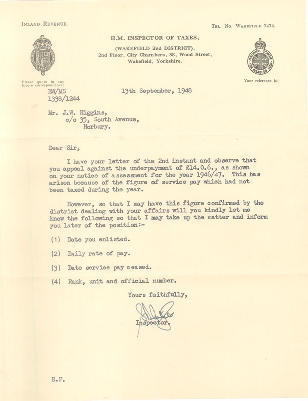 Name/TitleLetter to J.W. Huggins from H.M. Taxes 19/9/1948 - Re an under payment for £14-0-6 pence for 1946/47