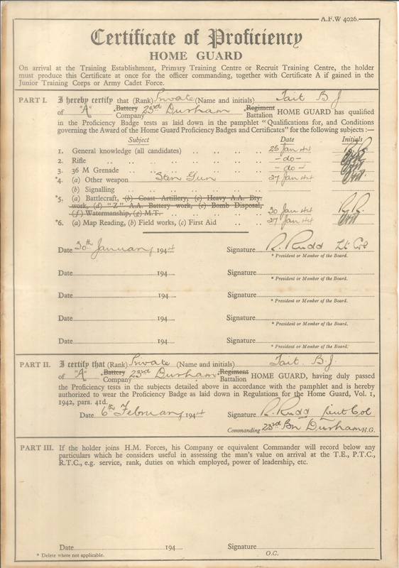 Name/TitleCertificate of Proficiency, Home Guard, Private B.J Tait, 23rdd Battalion Durham, 6/2/1944
