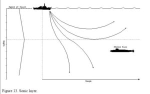 In the interwar years, research continued, and by 1938 the technology of bouncing sound waves off a submerged object that had been developed by the British into ASDIC anti-submarine detection equipment. A transmitter encased in a water-filled metal dome on the ship’s bottom sent out a series of ‘pings’. The operator sitting in the ASDIC compartment behind the bridge could turn the transmitter head to cover an arc of about 4 degree each side of the ship’s head. When the sound pulse struck an object it ‘echoed’ with a beeping sound and the operator altered the officer of the watch or ship’s captain, giving a range and bearing.