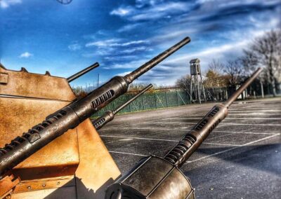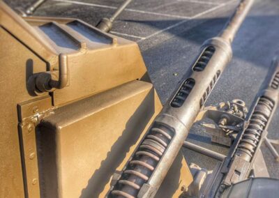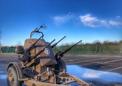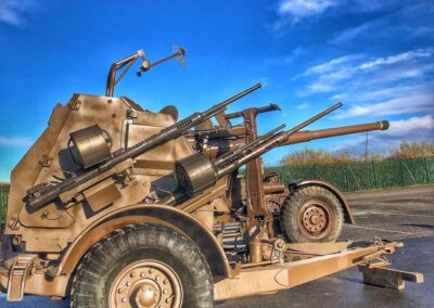 Various double, triple and quadruple mounts were developed. John Inglis Limited of Toronto, Ontario, in Canada produced many thousands of guns and some 500 quadruple mountings that saw limited service at the end of the war. These multiple mounts were both trailered and truck-mounted. Polsten Guns, magazines and ammunition boxes were also made in Australia by General Motors Holden in South Australia’s Woodville and Beverley Plants during WW2. They were used by the Australian Army onshore and on small boats. Several prototype gun mountings were also developed but did not see service.