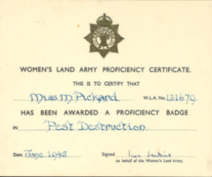 Figure 2: WLA Proficiency Certificate Awarded to women who passed the test. This was rewarded to a Miss M. Pickard. Source: Eden Camp Archives, 6482, Certificate – Women’s Land Army proficiency certificate – pest destruction – Miss M. Pickard – June 1945